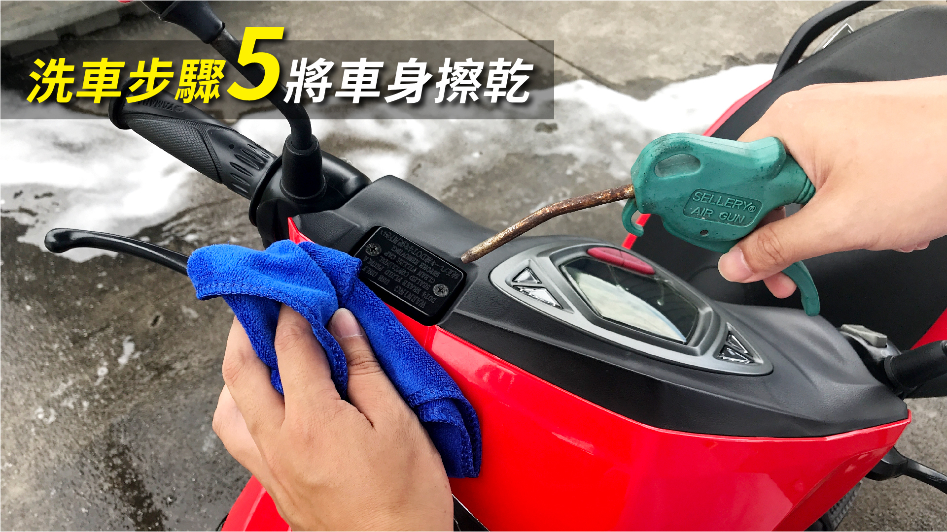 大致清潔完成並沖洗乾淨之後,我們可以使用風槍針對一些細微難擦的孔洞,像是後照鏡旁邊的縫隙、開關按鈕、鑰匙孔、碟盤…等等,將積水吹出來,然後在使用吸水布去擦乾。很多車友為了怕麻煩,都會省略吹水的動作,但孔洞積水沒有吹出來,除了會使一些零件生鏽之外,在機車行駛時也可能會因為風吹而使積水流出來,若沒有即時處理產生水痕的話,就白費剛剛那麼辛苦的洗車了。