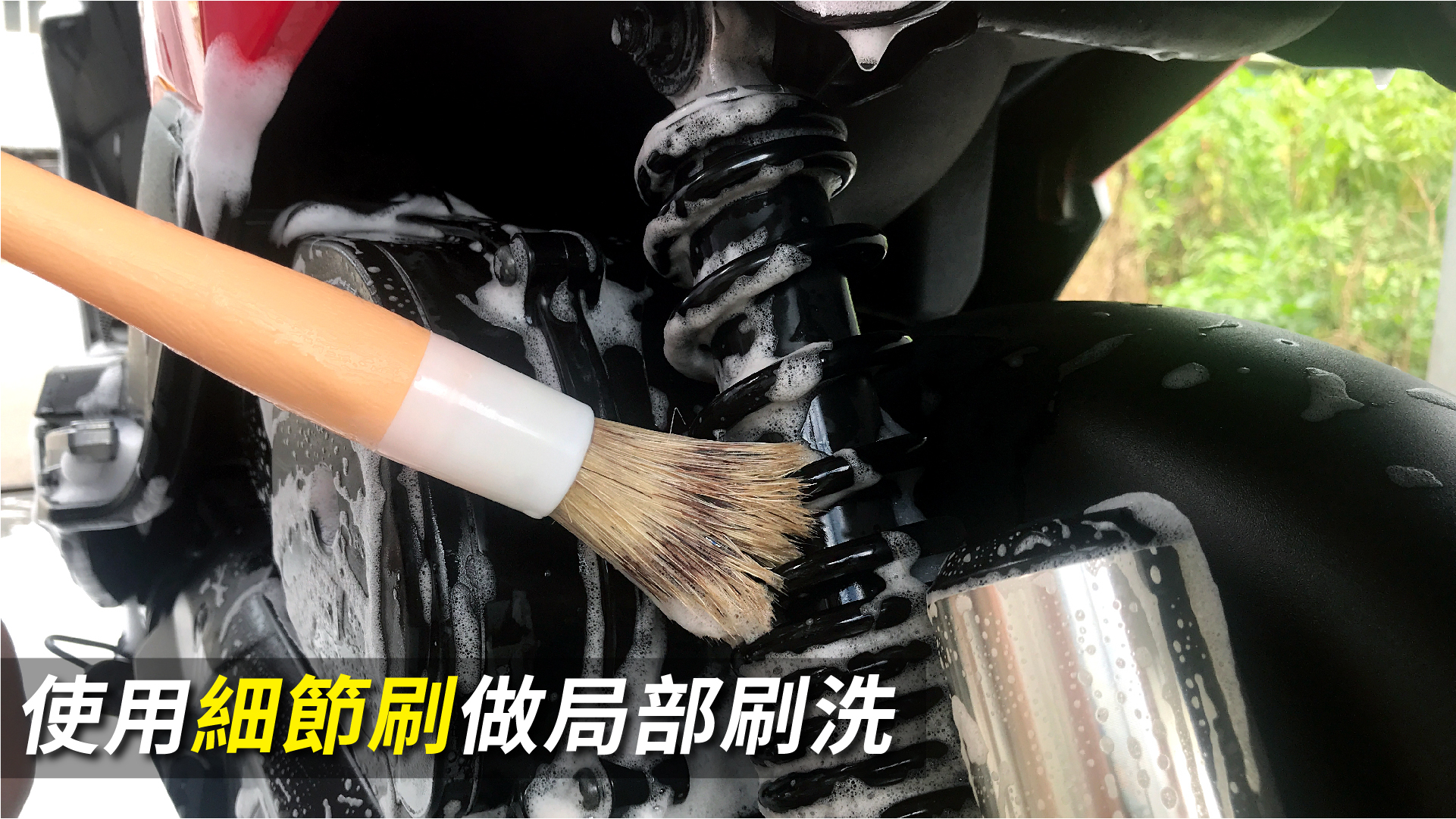 另外,因為車子有許多縫隙跟角度,會使雙手在刷洗的過程中容易受傷,所以我們特別使用全包覆式洗車手套,讓你可以洗的乾淨,同時又保護到雙手。而手套洗不到或洗不乾淨且孔洞及細節較多的地方,如後避震器彈簧、傳動…等,就可以再搭配細節刷來做局部刷洗。