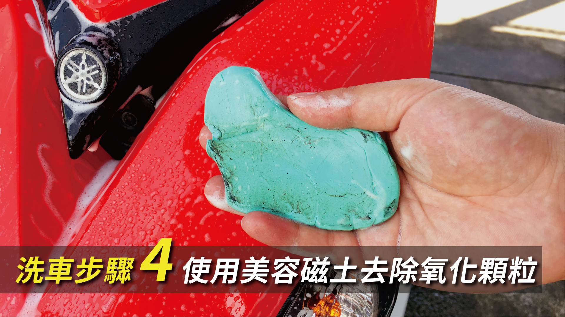 刷洗乾淨並沖完水後,其實還有一些肉眼看不出來的髒污,這時候可以使用手去檢查看看漆面摸起來是不是有粗糙的顆粒感,如果有的話,就可以使用美容黏土搭配泡沬水做二次的表面清潔,來去除附著在表面的氧化顆粒及頑固髒污,而完整的使用方式建議大家可參考另一篇使用教學,小編這邊就不在多做陳敘:第一次跑美容黏土就上手