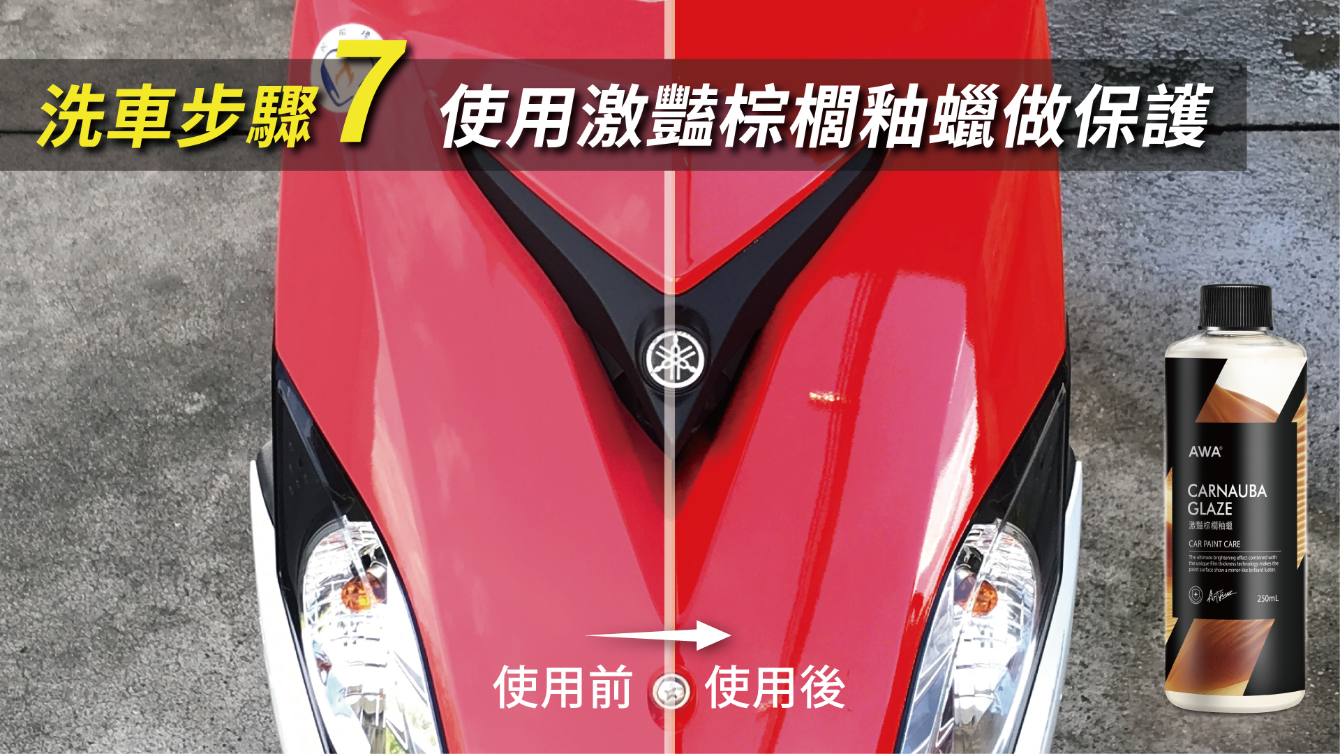 這隻蠟由AWA研發團隊專為機車塑膠漆面量身打造,並經過研發人員反覆測試及實驗,能有效對抗機車長期在外曝曬的環境。同時,它還結合了棕櫚蠟的特性,不但使漆面光澤度更好,也讓漆面有顯著的增艷效果及厚實的車漆膜厚感。而釉蠟的形態,使第一次使用的新手也可以輕鬆操作、好上好下。