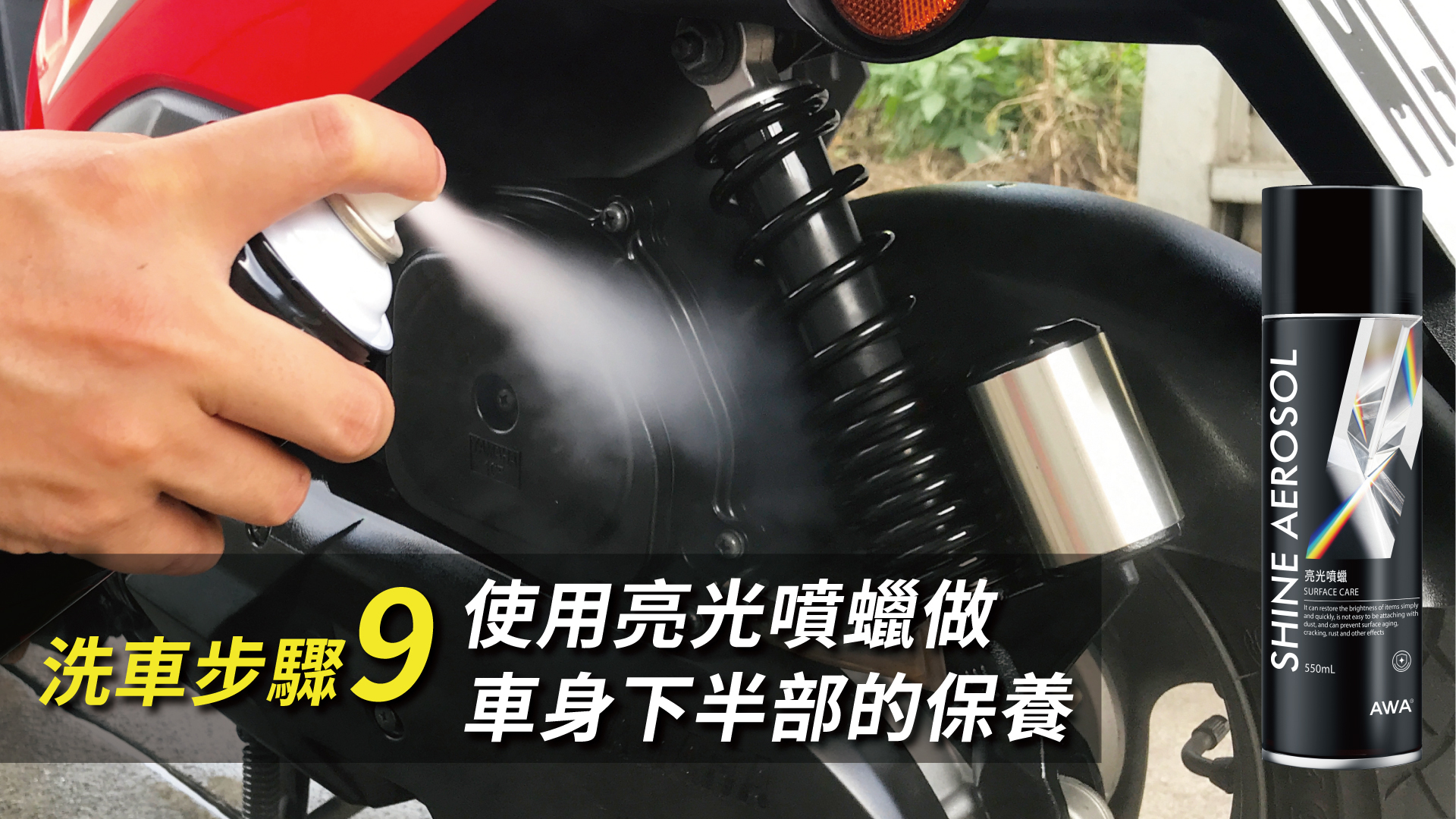 最後,就剩傳動蓋、排氣管、鋼圈這些比較接近地面且縫隙多又手不方便伸進去的地方,就可以使用亮光噴蠟來做最後的修飾及保養,輕鬆噴一噴讓你比新車還要新。