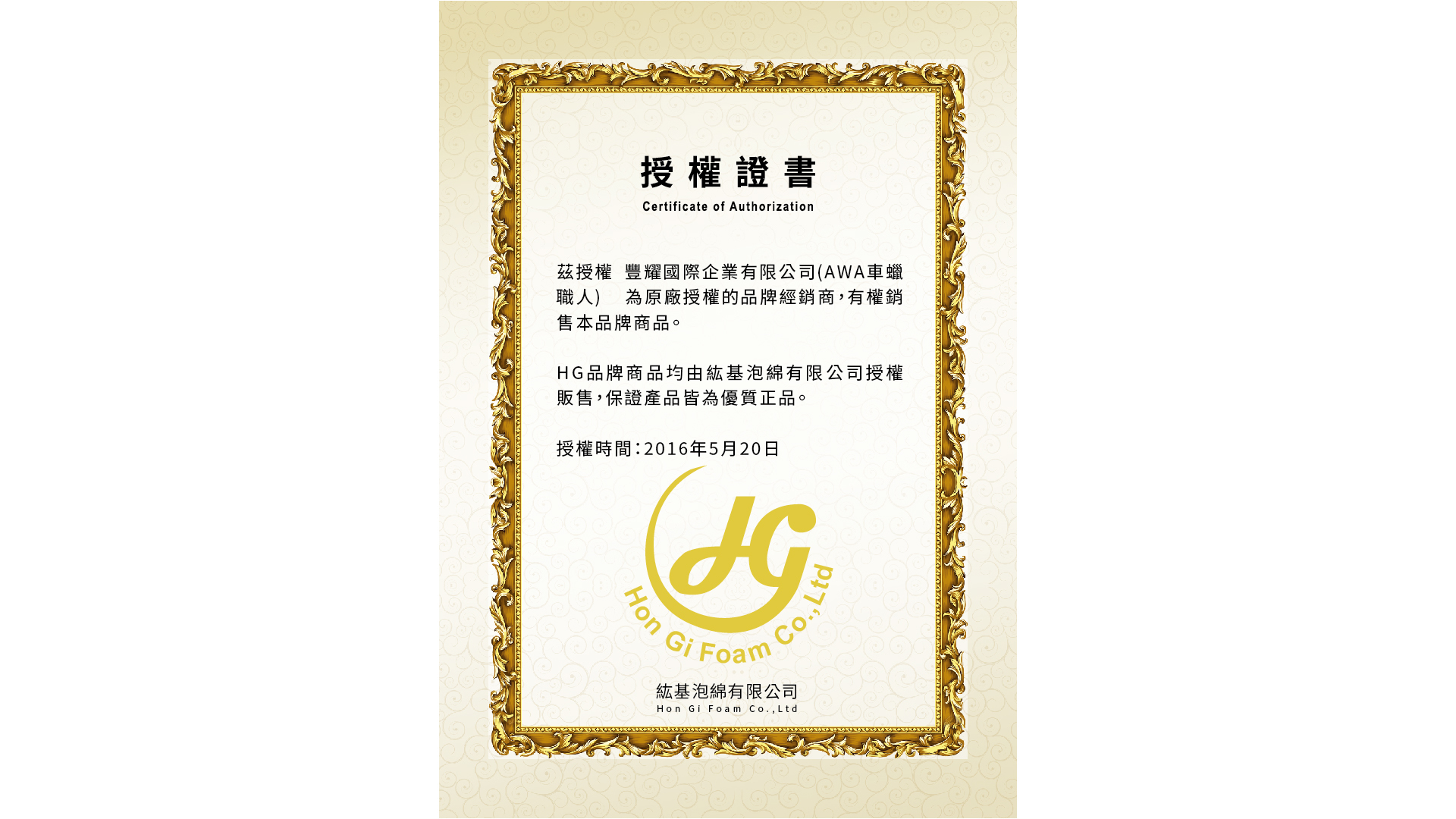 AWA車蠟職人已與紘基泡綿合作了一段好長的時間,直至今日原廠才授與了一份正式的授權證書,在此也特別感謝原廠對AWA車蠟職人的肯定