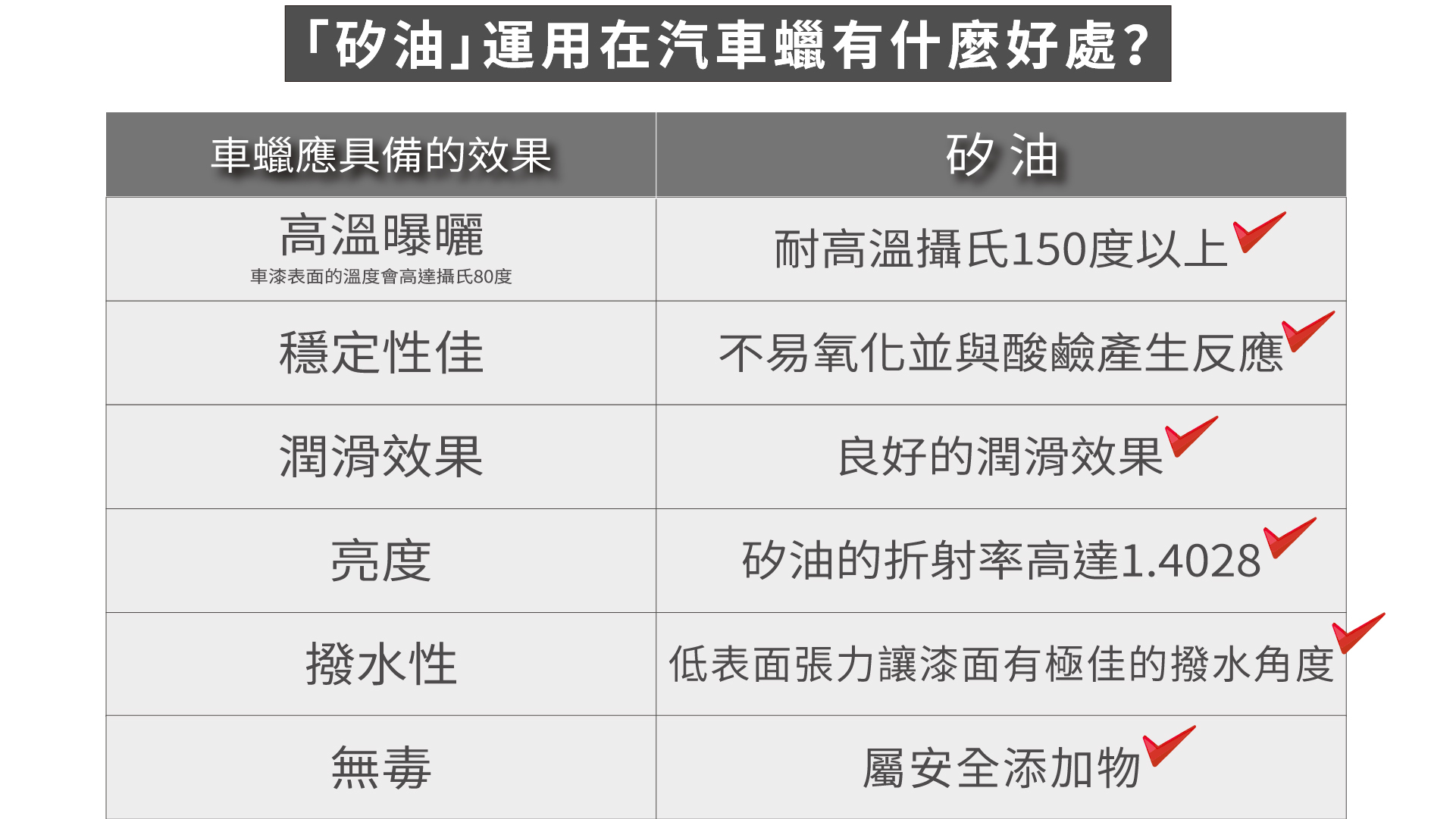 通常車子停放戶外在台灣夏天的高溫下,車漆表面的溫度會高達攝氏80度,那我們添加在汽車蠟中的成份就必須要先能達到耐80度高溫的標準,而矽油耐高溫至少都有攝氏150度以上,經實驗室測試矽油在150度的高溫下經過24小時的烘烤,不僅不會變質,其揮發成份更只有0.1%